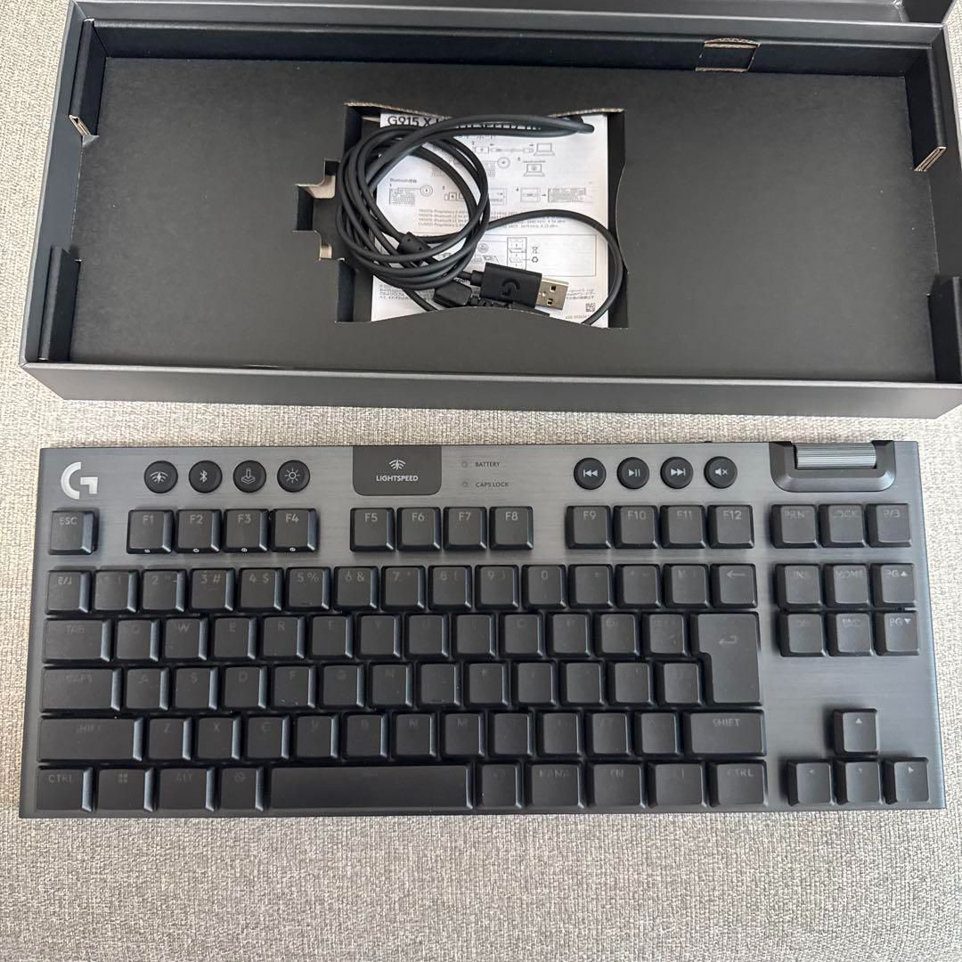 メカニカルキーのLogitech G915 TKLキーボード本体です。購入後、一度試したところ合わなかったため、ほぼ未使用に近いです。