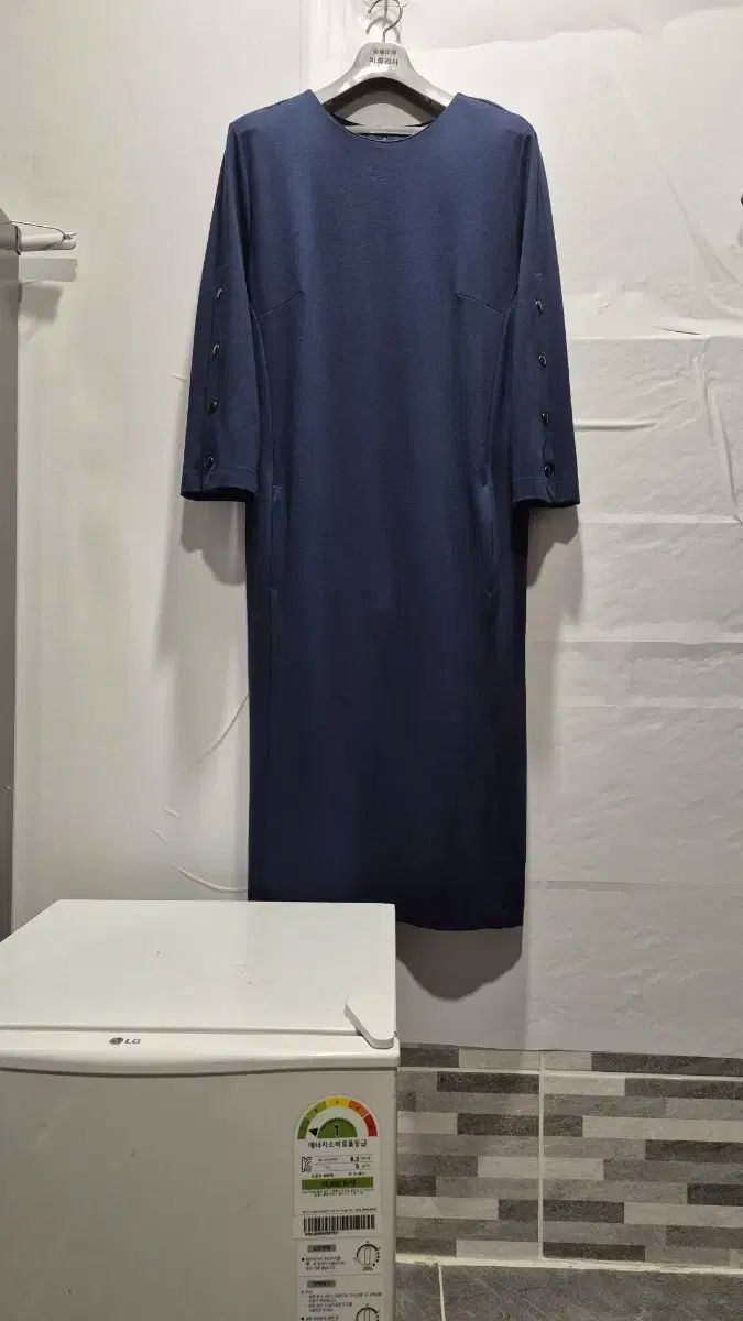 オイルリリーのロングドレスです。ネイビーカラーで落ち着いた感じがします。袖にはボタンディテールがあってアクセントになっています。