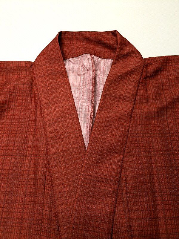 単衣 単衣の着物 浴衣 男物 化繊 赤色地に格子模様 裄72 Lサイズ 吸湿速乾 防シワ ポリエステルゆかた