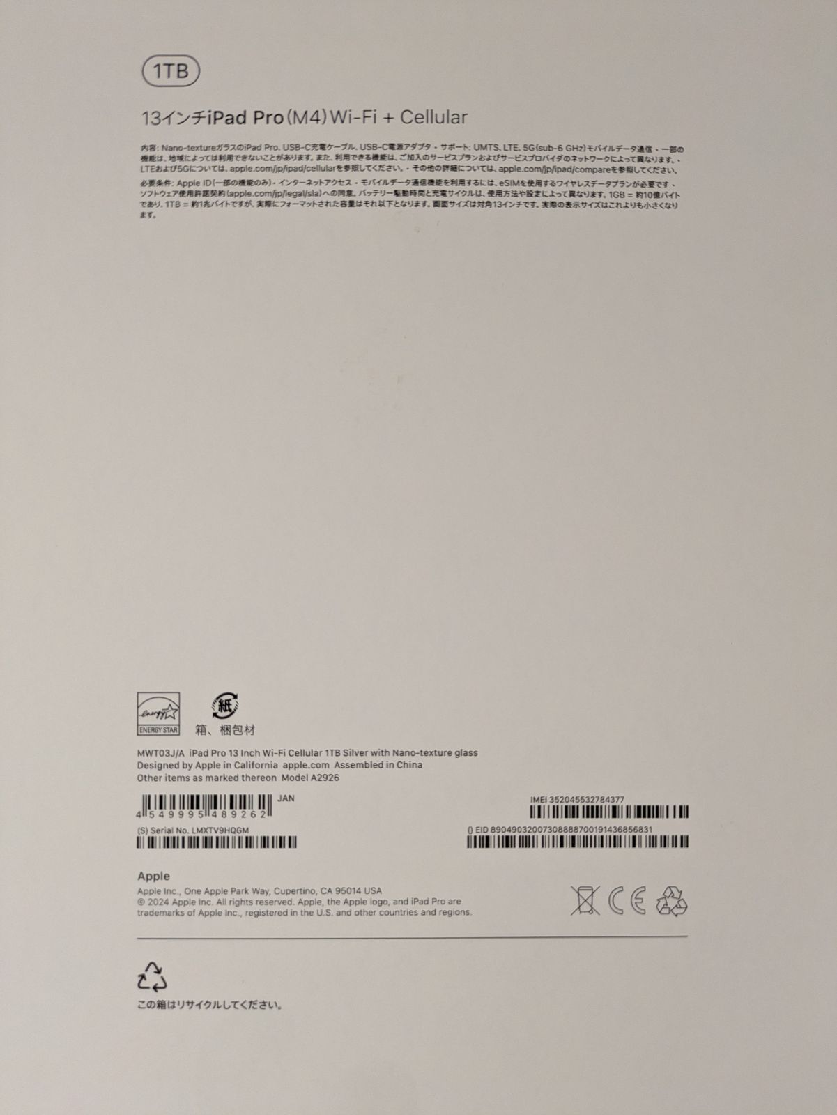 iPad Pro 13インチ M4です。セルラー+Wi-Fiモデル。1TB。色はシルバー。ナノテクスチャーガラスモデル。