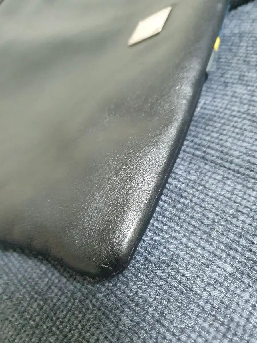 これはネイビーカラーのMCMメンズクロスボディバッグです。バッグの中央に白、青、黄色の点線があります。