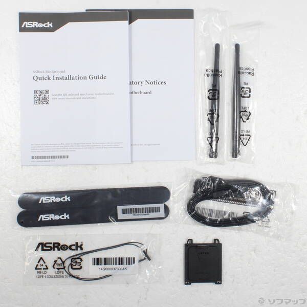 〔付属品〕Quick Installation Guide、ASRock WiFi2.4/5/6GHzアンテナ×2、ベルクロストラップ×2、SATAフラットケーブル×2、サーミスターケーブル