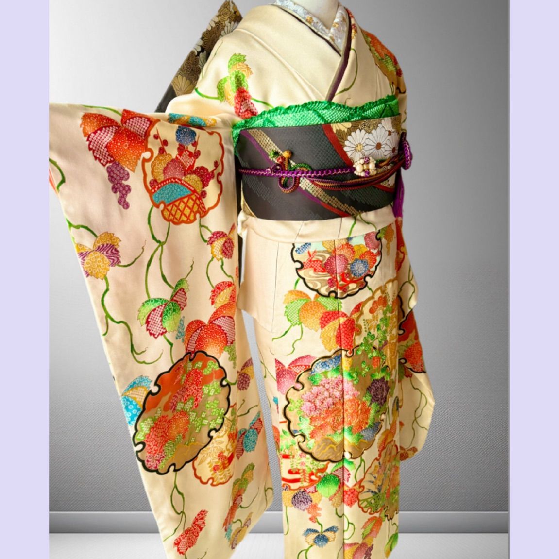 豪華で大変華やかなお振袖、なかなか出会わない希少な雰囲気のお品です。しっかりとした上質な生地の地色は淡いクリーム色系、淡いシャンパンゴールド系、になります。内側から滲み出るような美しい輝きと、一目で魅了されてしまう多色使いの大胆な柄行き。。金彩や金駒刺繍と贅を尽くした逸品です。 成人式はもちろん、様々なお祝い事にお勧めです。