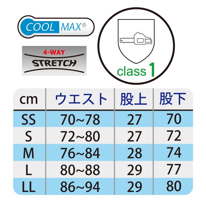 オリジナルのチェンソー用防護パンツ。ワイドベンチレーション付、ブーツ用フックでめくれも防止。EN取得のクラス1で林業作業に特化したポケット仕様。超伸縮素材でバツグンの伸縮性を持ち、軽量化と通気性にこだわったスタンダードモデル。