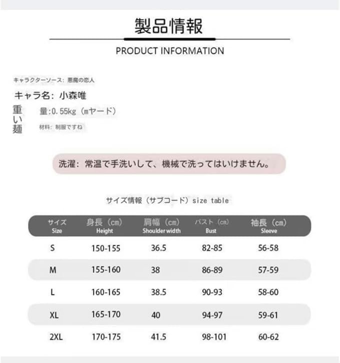 【素材】ソフトな素材を使用し、体型に合わせたシルエットデザインで、着心地が快適です。 受注品は製作に時間がかかります。配送希望日がございましたら、ご註文前にお問い合わせ下さい。受注生産の製品ですので、お届けまで遅れる可能性もございますので、予めご了承ください。出荷までに約7~10日かかります。衣装は手作りのため、多少の違いがある場合もあります。 原作を忠実に再現し、衣装にも工夫を凝らしました。ハロウィン、クリスマス、記念日、テーマパーティー、学園祭、文化祭、フェスティバル、プレゼント、デート、コスプレ、コレクションなど、様々なシーンで使用できます。 商品のカラーは、写真撮影・パソコン画面表示等の環境により、多少異なる場合がございますので予めご了承ください。衣装は手作りのため、多少の誤差が生じる場合がございます。また、返品、交換、キャンセルの場合はご注意ください。 撮影の関係で写真と実際の商品はPCの環境、等により、画面上の色と商品の色が異なって見える場合もございます。衣装は100%手作りなので、若干差異がある場合もございます。 続きを見る この商品について