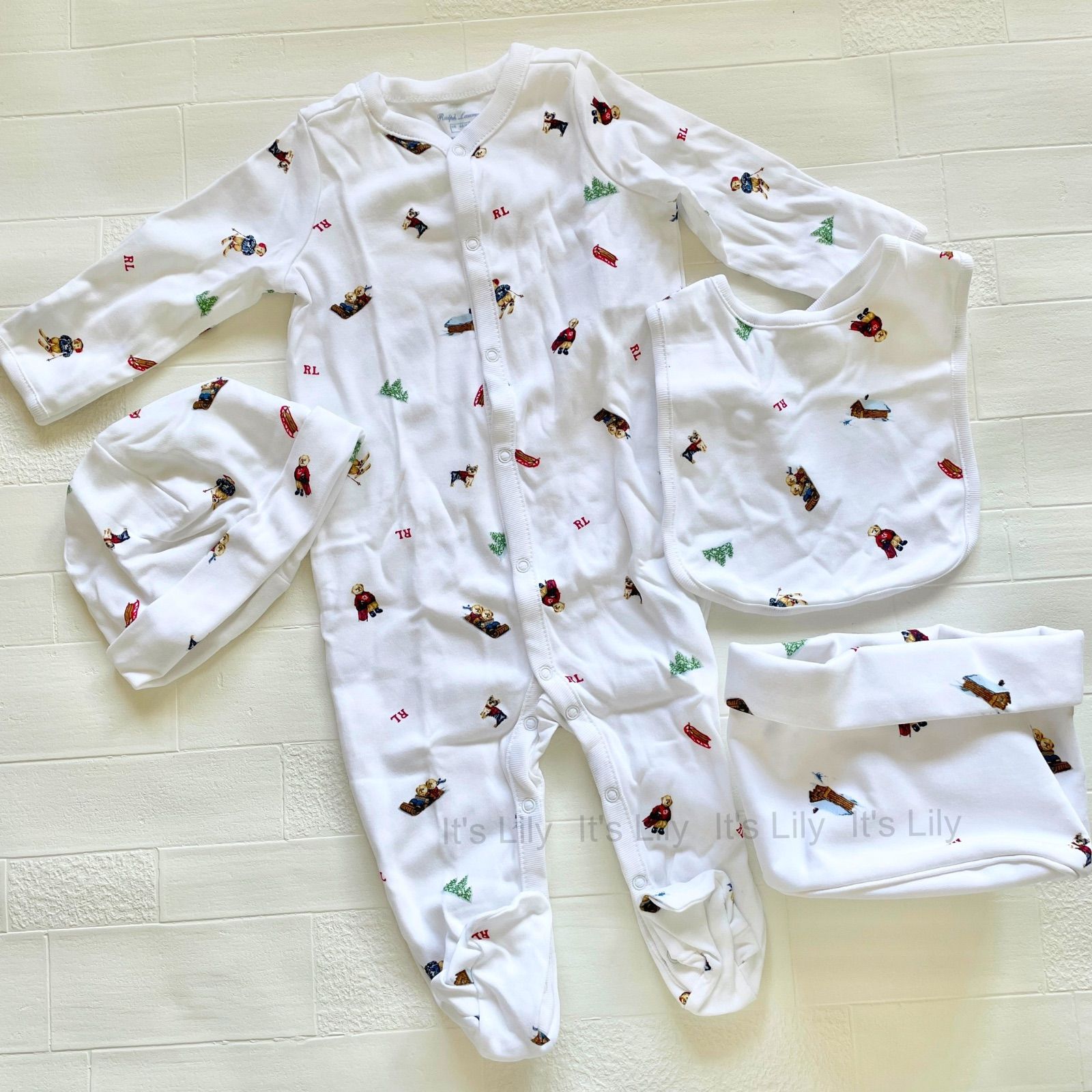 ポーチ、ロンパース、スタイ、帽子の4点セット