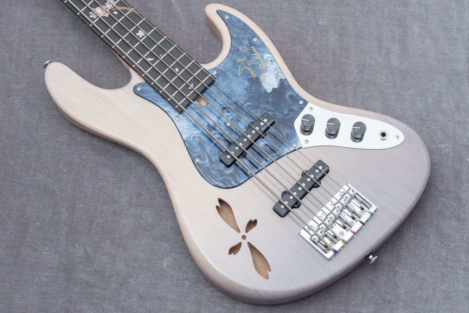 その魅力はなんといっても、ボディトップに贅沢に使用された日本の春を象徴するSakura材と、ピックガードのアイコニックなツバメのデザイン。