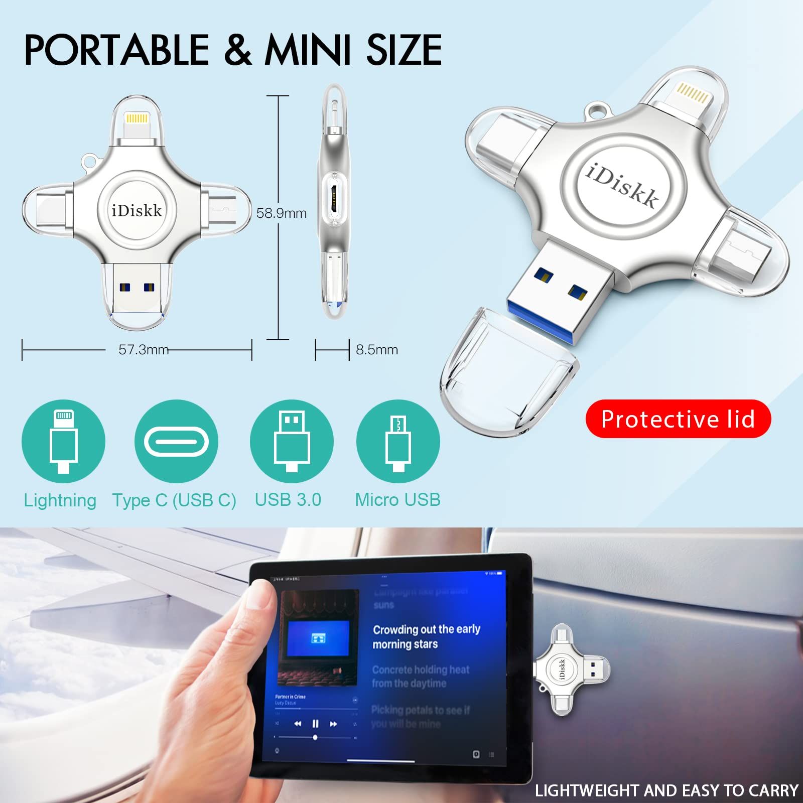 【多機能4 in 1 USBメモリ・プラグ&プレイ】 iPad usbメモリーをiPhoneやiPadに挿して、すぐ簡単に使える。4つのコネクタに対応したusbフラッシュメモリは、Type-C、MicroUSB、LightningとUSB3.0のコネクタを搭載され、パソコンからスマートフォンまで、さまざまな端末に簡単に高速伝送でき、最新なiPad Proにも対応します。(ご注意: 1. AndroidとType-Cスマホ はOTG機能が必要あります。 2.iTunesの音楽ファイルやビデオファイルはDRM(デジタル著作権管理) 保護されているため、フラッシュドライブに転送することはできません。 )ご使用中に、なんにか問題がございましたら、お気軽にカスタマーサービスにご連絡出さいますようお願いいたします。こちらで第一時間に対応させていただきます。