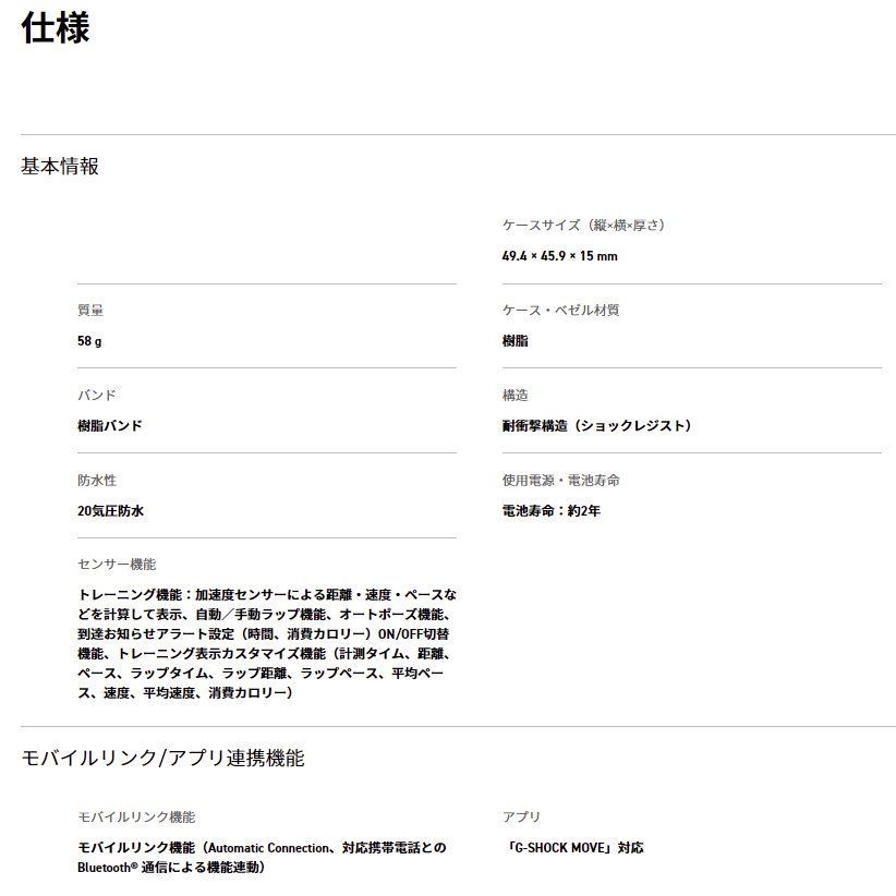 G-SHOCKのスポーツライン「G-SQUAD」。距離計測機能やスマートフォン連携機能等、ランニングなどのトレーニングに役立つ機能を搭載しました。スマートフォンのGPS機能と連携することで計測距離を補正。一度補正すると次回から時計単体で走行距離の計測ができます。更に走行ペースの計測や自動でタイムを計測するオートラップ機能も可能に。また、専用アプリでライフログやアクティビティ履歴などの確認、トレーニングプランの自動作成等もできます。ディスプレイには高精細MIP液晶を採用し、スーパーイルミネーターも搭載。バンドにはソフトウレタン素材を使用しフィット感を高めるとともに、細かく調整ができるようバンド穴の数を多く設けています。また、多機能を日常的に使用した際でも約2年の電池寿命を実現。日常の健康管理からランニングの持久力強化まで幅広く役立ちます。