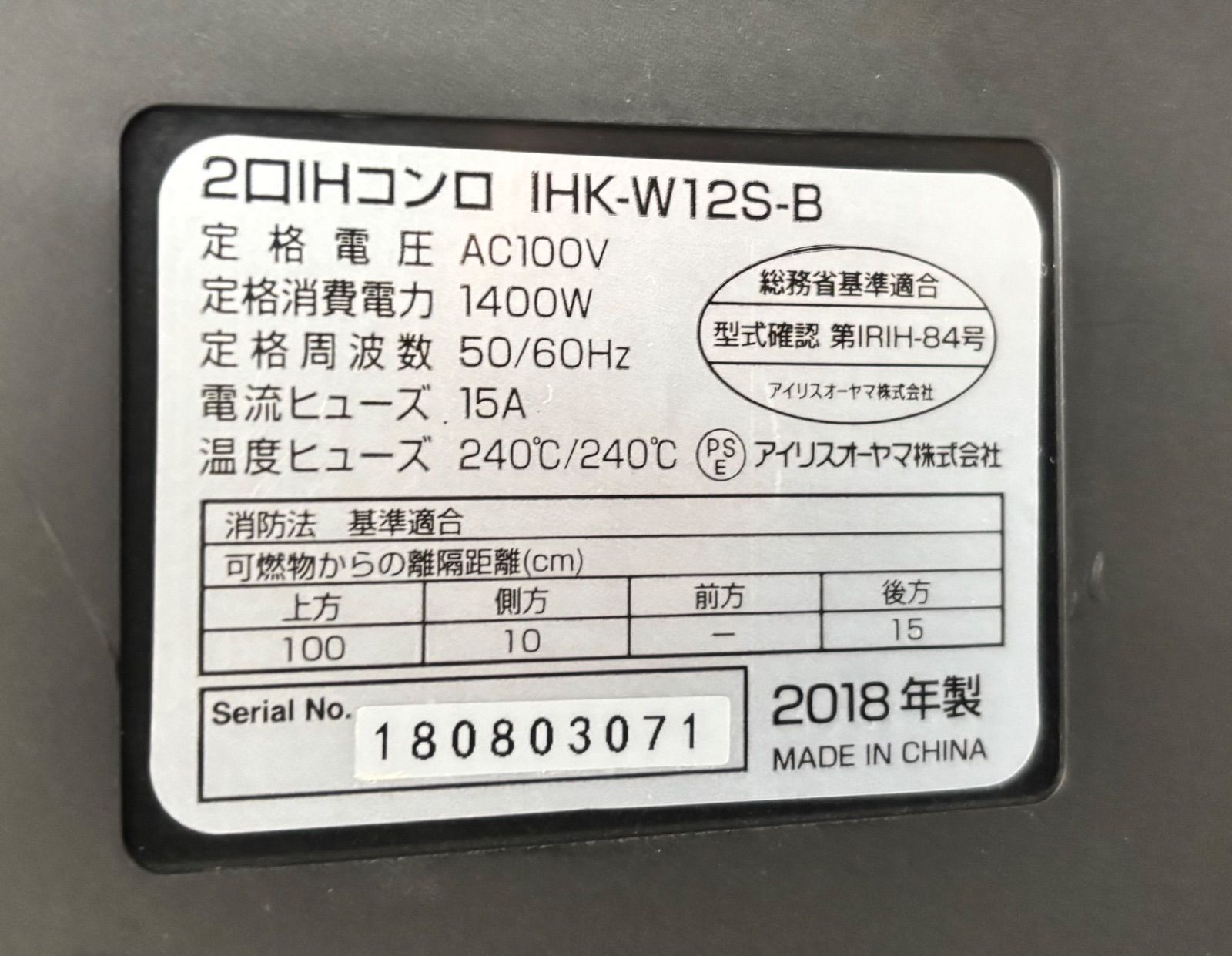 アイリスオーヤマ IHコンロ 2018年製 IHK-W12S-B