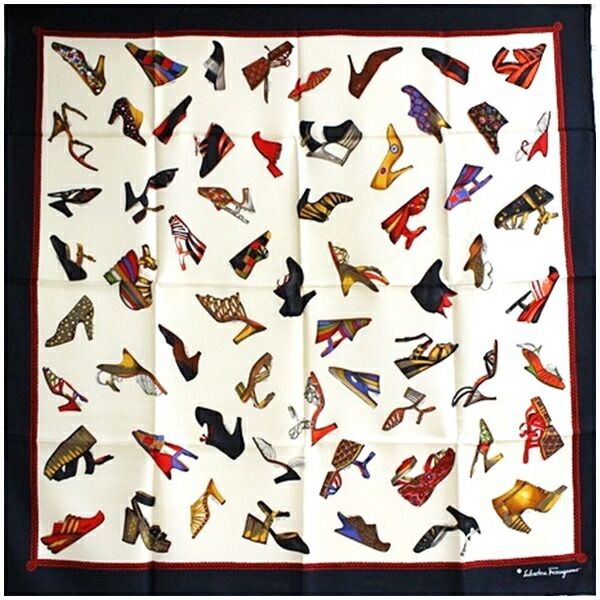 サルバトーレフェラガモ シルク スカーフ ホワイト ネイビー パンプス柄