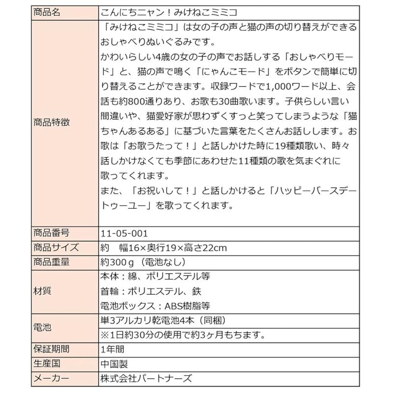 もしも猫とはなせたら。2022年、おしゃべりパートナーシリーズ待望のみけねこが登場! にゃんこモードとおしゃべりモードの2つのモードを選べます。 にゃんこモードは本物の猫の声、おしゃべりモードは本物のこどもの声でおしゃべりします。 操作はとても簡単!簡単遊び方ガイドも付属します。 動物を飼いたくても飼えない方へ、アレルギーや住宅の事情でペットを飼えなくても生き物とのふれあいを楽しみたい。 そんな方のために生まれた、おしゃべりパートナーです。