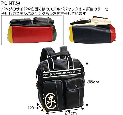 カステルバジャック(CASTELBAJAC)のリュック。[ポイント]ベーシックな本体カラーにカステルバジャックらしい4原色がちらりとのぞく配色がポイントのカジュアルリュック。マチ付きの便利な外ポケットや880gと軽量な仕様にくわえ持ち手付いているのも魅力です。大きな開口部からペットボトルやA4ファイルなどをすっぽりと収納できます。[機能・収納]● 前面ファスナーポケット● 前面ファスナーアウトポケット (約 幅12.5×高20cm)● 前面カブセポケット(約 幅12.5×20 cm)● 両サイドポケット(約 幅12×高20 cm)● ファスナーポケット● 3段仕切りポケット[型番:24711]