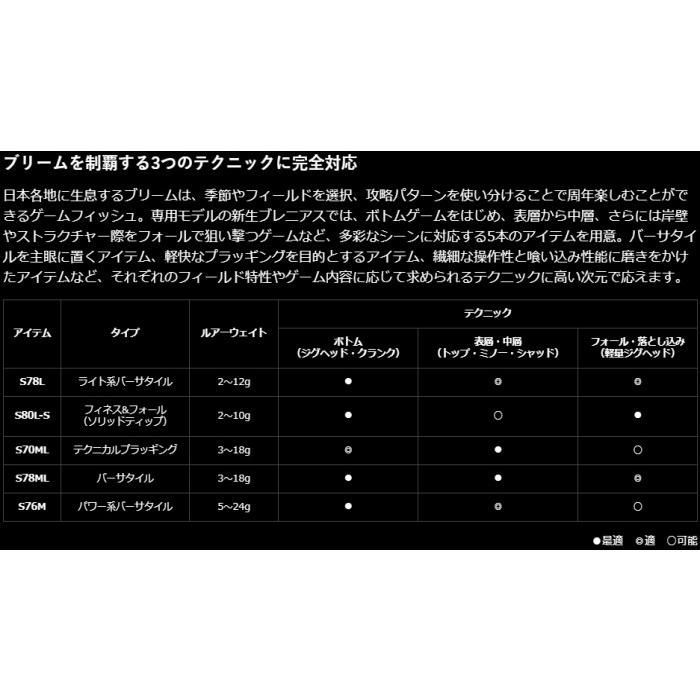 ■ボトムゲームをはじめ、表層から中層、さらには岸壁やストラクチャー際をフォールで狙い撃つゲームなど、多彩なシーンに適応するブリーム(クロダイ・キビレ)専用ロッド。ブリームゲームに求められる性能を高次元に備え、さまざまなテクニックやフィールドで活躍。柔軟なティップはボトム感知力とレンジキープ力を高め、ブリーム特有の小突くようなアタリに追従する喰い込みの良さが特長。継部にはバットパワーを高める並継設計を採用。ブリームの硬質なアゴを貫くフッキングパワー&レスポンスを確保。また重心位置が手元側に寄ることで、軽量バランス化を実現。グリップの素材や形状にもこだわり、さらなる軽量化と感度の向上を達成しました。