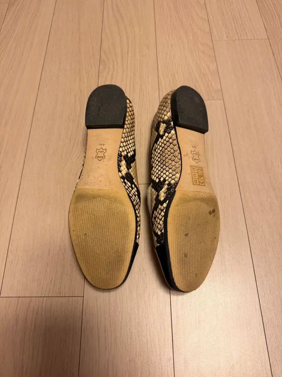 トリーバーチ フラットシューズ 235サイズです。パイソン柄にゴールドのロゴが高級感があります。つま先はブラックエナメルで補強されており、底に4万円でビブラムを貼りました。