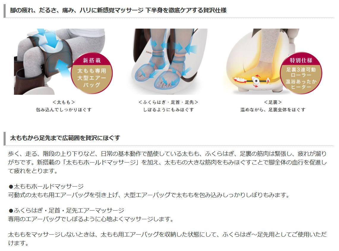 「太ももホールドマッサージ」は、太もも専用の大型エアーバッグが太ももを包み込み、しぼるようもみほぐします。