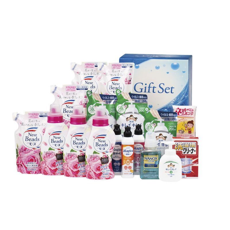 ■商品内容:ニュービーズリュクスクラフト(本体740g×3・詰替650g×4)・CHARMY Magica除菌+220ml・CHARMY Magica酵素+(オレンジの香り・フレッシュピーチの香り)各220ml・NANOX one PRO(本体)380g・キレイキレイ薬用液体ハンドソープ(本体250ml・詰替200ml×3)・洗濯槽クリーナー(5錠)・ネットスポンジ