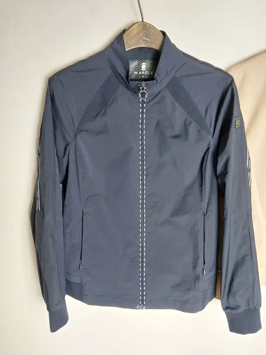 これは広角の女性用ゴルフトップのセットで、サイズ95です。ネイビーのウインドブレーカーとベージュのスウェットシャツで構成されています。すっきりとしたデザインなので、フィールドだけでなく普段着にも使えます。