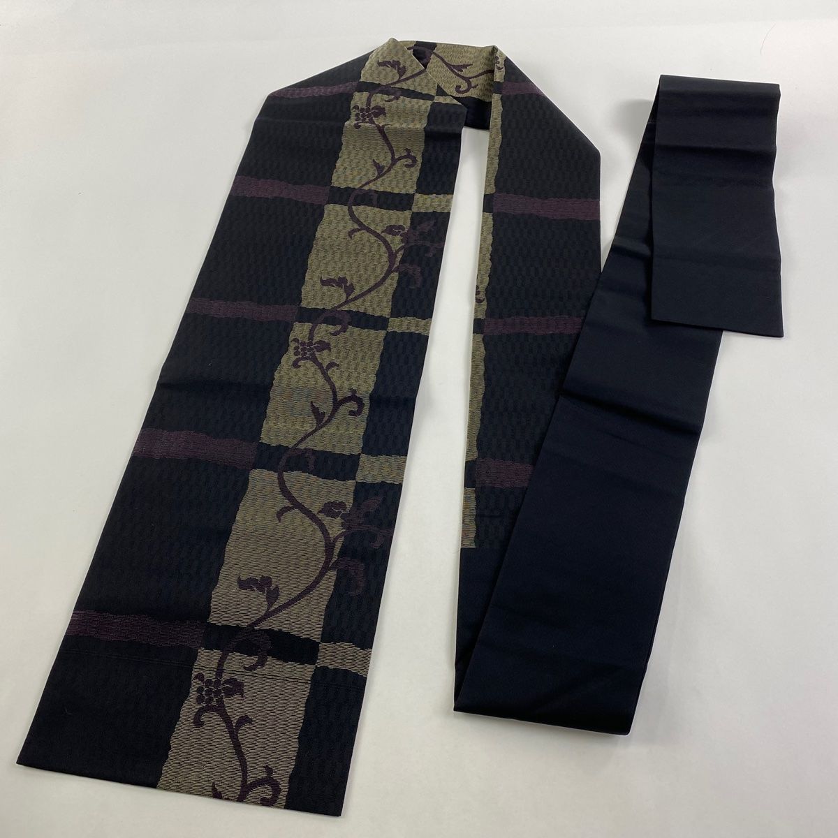 名古屋帯 草花 変わり市松 黒 正絹