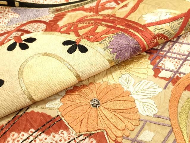 平和屋着物 アンティーク 大正ロマン 丸帯 絞り 駒刺繍 檜扇花鼓文 金糸 正絹 ob