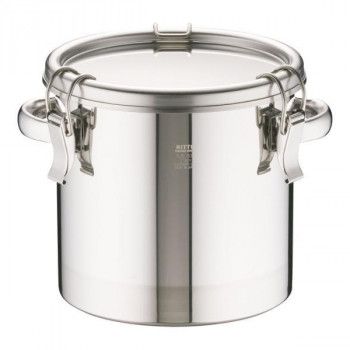 本体とフタの締め付けをキャッチクリップで行う密閉式容器です。内外面バフ研磨仕上げです。シリコンゴムパッキンを使用しています。底面フラットタイプのため粉・液だまりがありません。