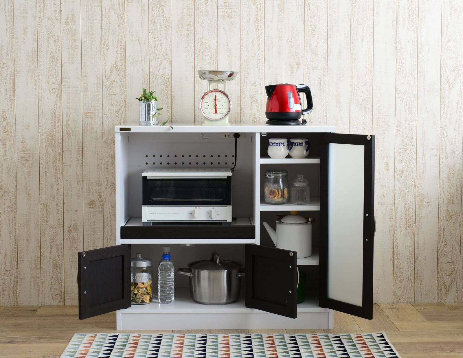 ●カラーコントラストがオシャレなキッチン収納シリーズ。<br>●ハイライプからコンパクトなものまで、サイズ展開が豊富でお好みのサイズが見つかります。<br>●バイカラーがキッチンに映える、おしゃれなレンジ台です。<br>●右の扉内は全て可動式の棚になっており、入れるものに合わせて簡単に高さを変えることが出来ます。<br>●ガラスはミストタイプのガラスを使用。入れたものをぼかし、生活感を緩和します。<br>