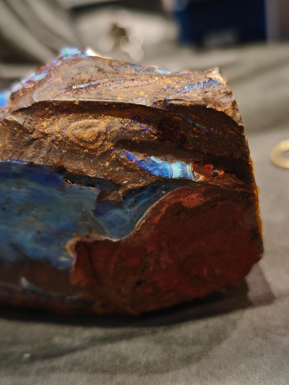 ブラックオパールとも言えそうな青色で母岩の隙間にもキラキラとオパールが入り込んでいるのが見えます。