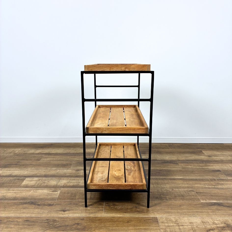 こちらはオールドチーク無垢材の風合いを贅沢に活かしたトレイ型の棚と、圧迫感のないブラックスチールの組み合わせが特徴のシェルフです。