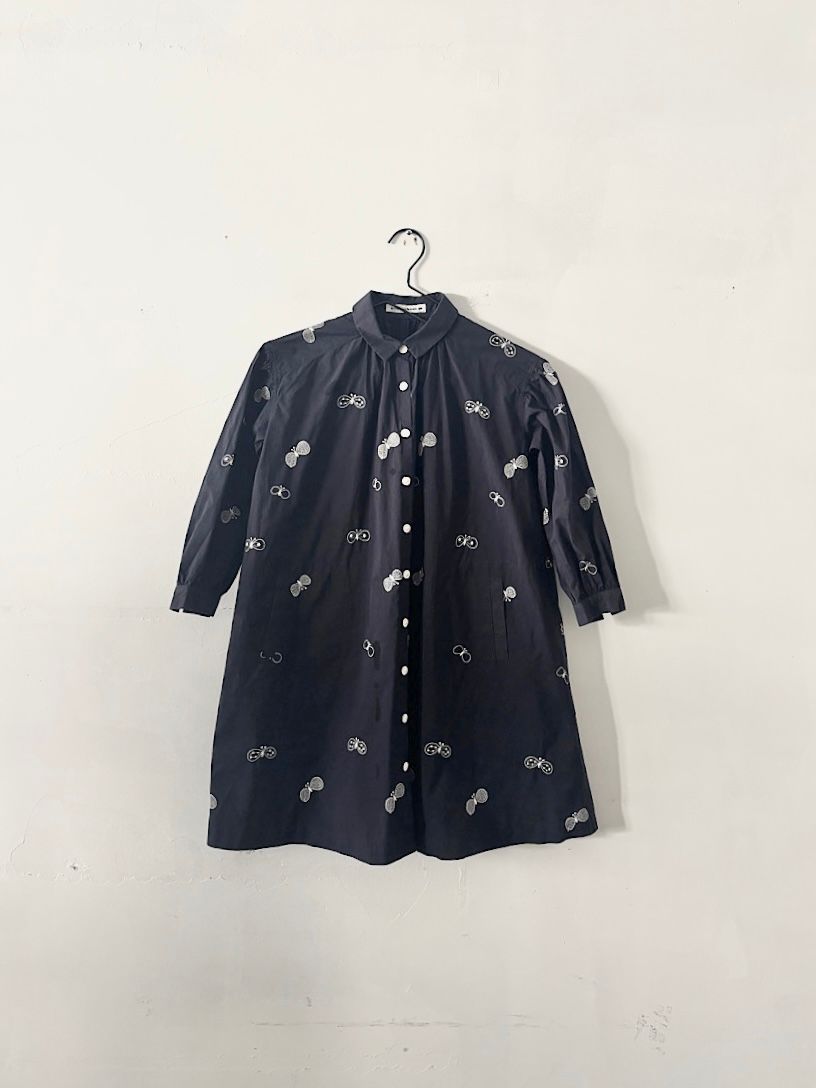 カラーはネイビーでちょうちょの刺繍が入ったキッズサイズのシャツワンピースです。
