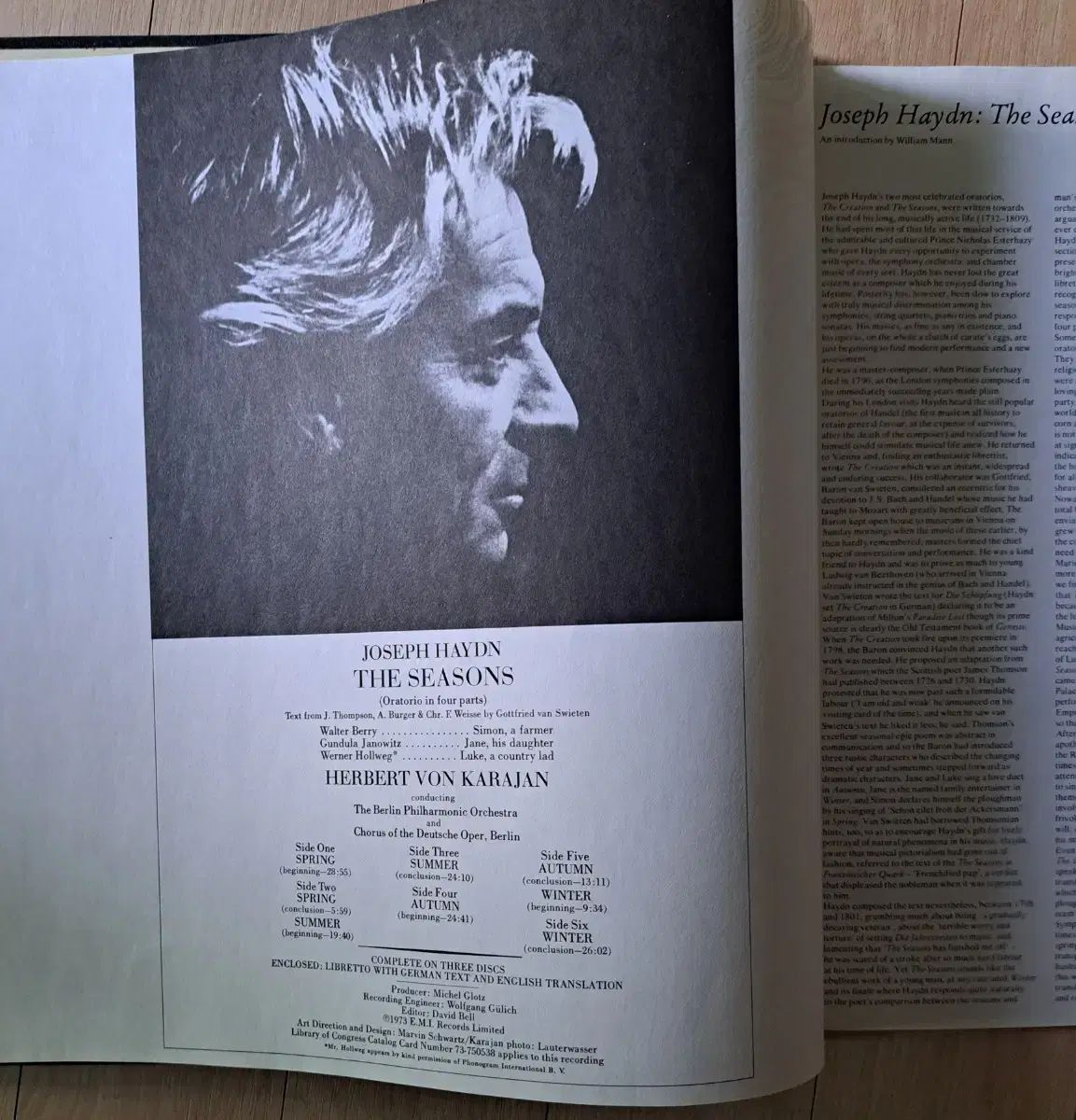 天地創造と共にハイドンの最も重要なオラトリオで、4つの季節を音楽的に表現した作品です。季節ごとに代表的なアリア、合唱曲、自然を描写する管弦楽が含まれており、自然の音を絵画的に構成し、四季の特徴を多様な感情でドラマチックに表現しています。1972年、ベルリン・ドイチュ・オペラ座のソプラノ、グンドゥラ・ヤノヴィッツ、テノール、ヴェルナー・ホルヴェーク、バリトン、ヴァルター・ベリー、ベルリン・フィルとカラヤンの名演を収めた貴重な名盤です。
