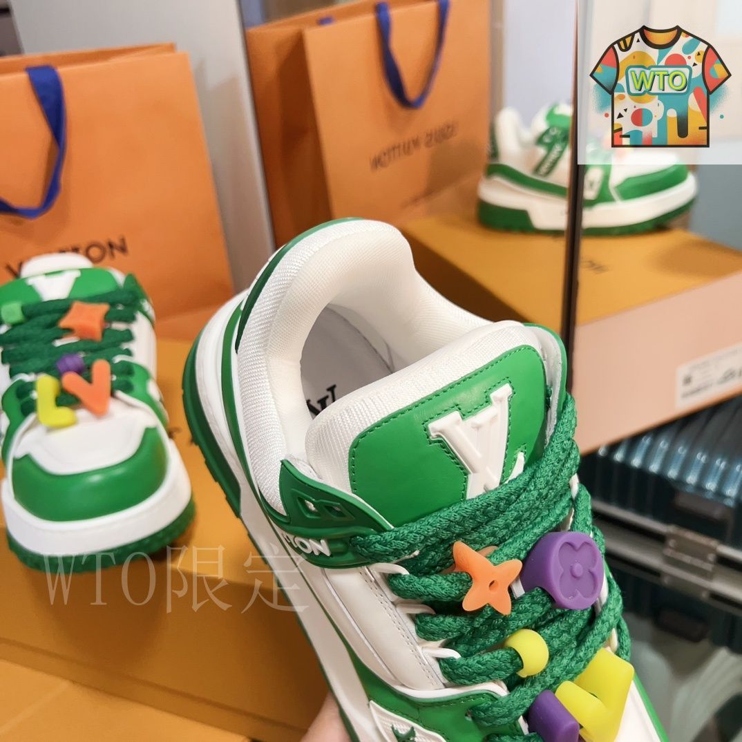 この商品の価格は 25000すぐに購入・お支払いいただき、注文画面でメッセージをお願いします。 この Louis Vuitton LV Trainer 限定モデルは、カップルで着用できる「パンシューズ」として注目を集めるスニーカーです。単色の??性を打破した多彩な配色が若々しい印象を与え、愛らしい「太ったトレーナー」(通称「発福鞋」)のシルエットが、可愛らしさと高級感を両立させています。最も人気の「胖子鞋型」を採用し、どのカラーバリエーションも個性的で魅力的。35~44 の幅広いサイズ展開で男女問わず快適に着用可能で、「目を閉じて買っても後悔しない」と言われるほどの人気アイテムです。