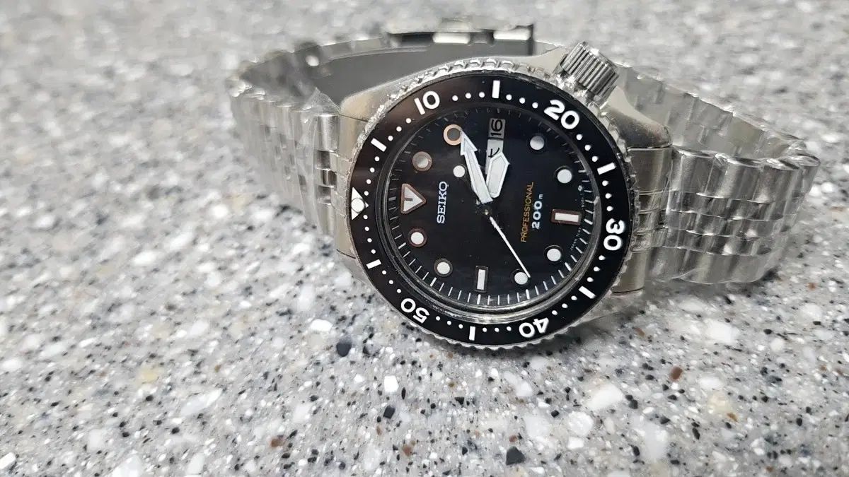 セイコー プロフェッショナル SUPER QUARTZ 7c43-6010 です。黒いダイヤルに銀色のメタル時計ベルトがよく合います。状態は写真の通り、ガラス傷と竜頭の硬さ(ジョーン)は存在しますが、全て正常に作動中です。ベゼルもよく回ります。現在正常に作動中であり、安くお譲りします。安く提供いたします。
