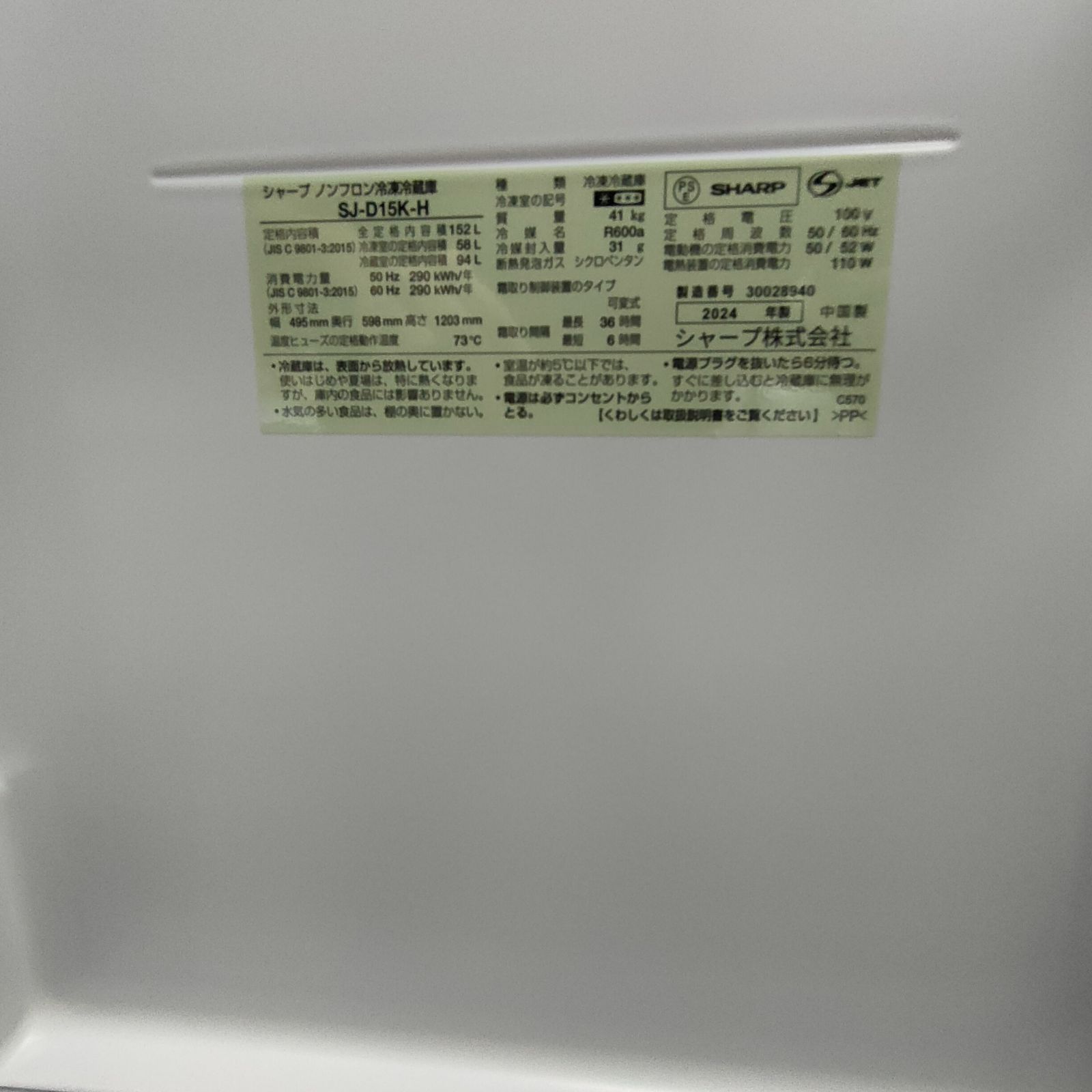 SHARP 冷蔵庫 152L 2024年製 SJ-D15K-H