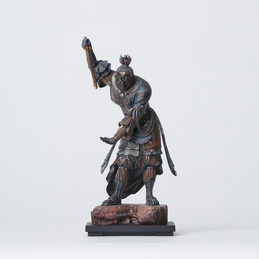 生き生きとした強い動きのあるポージングが特徴で、鬼気迫る表情と指先まで漲る緊張感、前後にも大きく空間を使う独特の造型をそのままに手のひらサイズに表現しました。頭上には戌神像であることを示す犬の顔が覗きます。