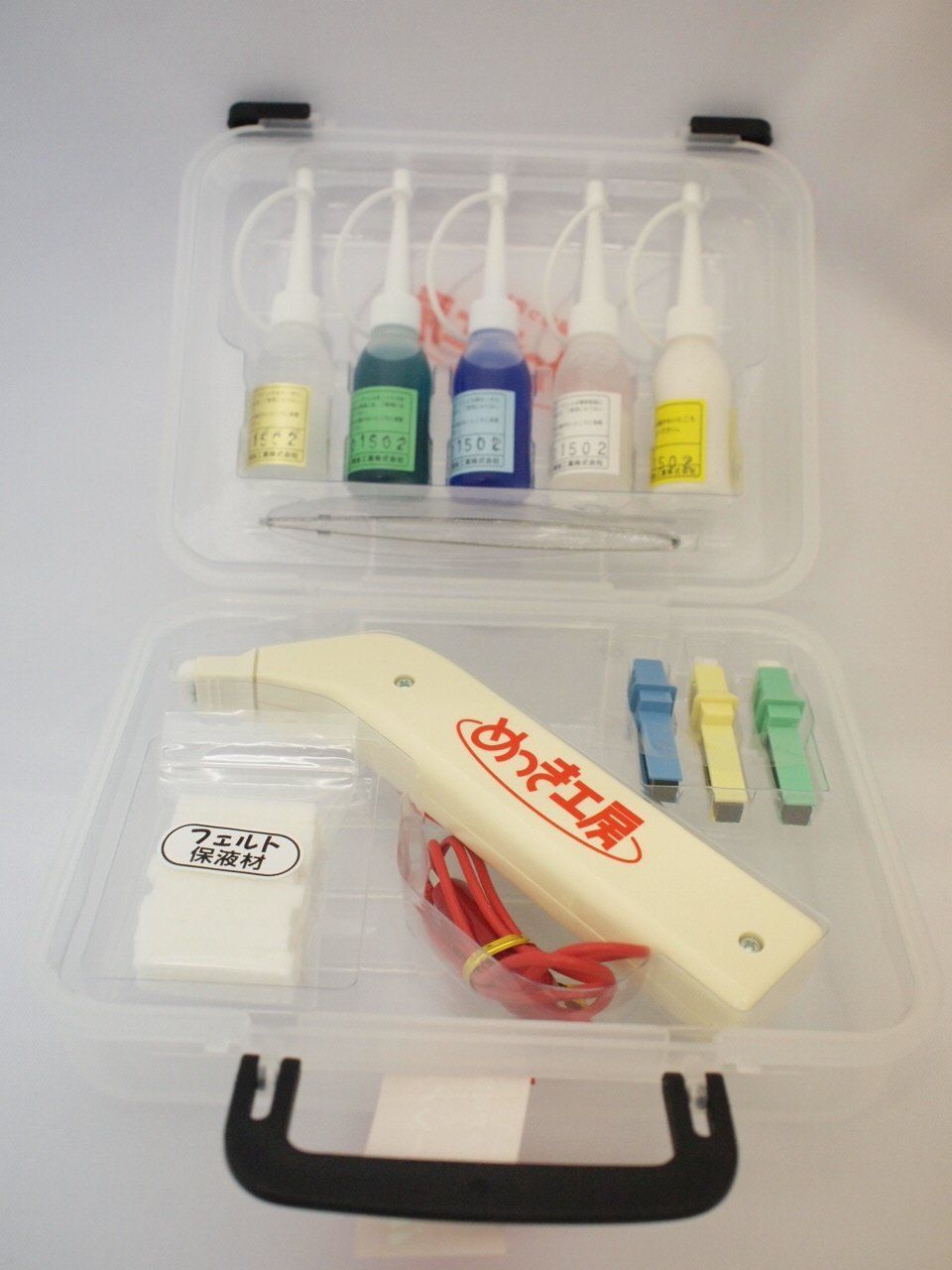 セット内容:プラスチック収納ケース入り/金属磨き・脱脂液・銅・ニッケル・金めっき液 各18ml