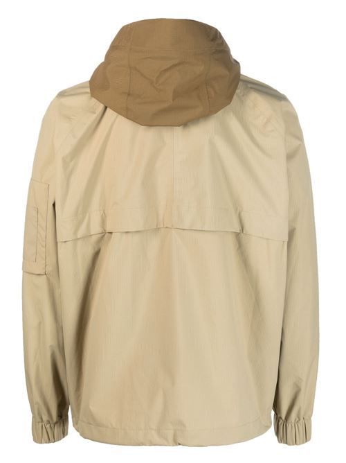 トープ、トープブラウン、ツートーンデザイン、撥水加工、防風、ストームフラップ、ドローストリングフード、フロント2WAYファスナー、長袖、ゴム入り袖口、両サイドスリットポケット、袖ファスナーポケットが特徴です。このユニセックスアイテムをお買い求めの際は、標準的なメンズサイズであることをご留意ください。