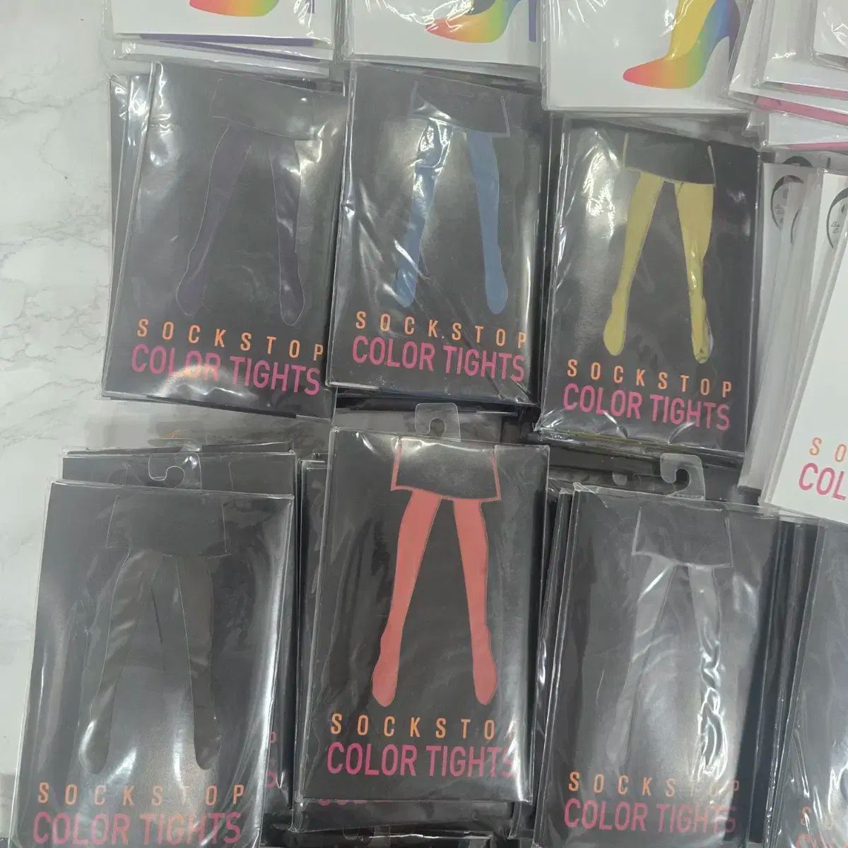 新作ソックスストップカラータイツを100点販売している商品です。さまざまな色が混ざり合って個別に包装されています。リーズナブルな価格で販売しています。
