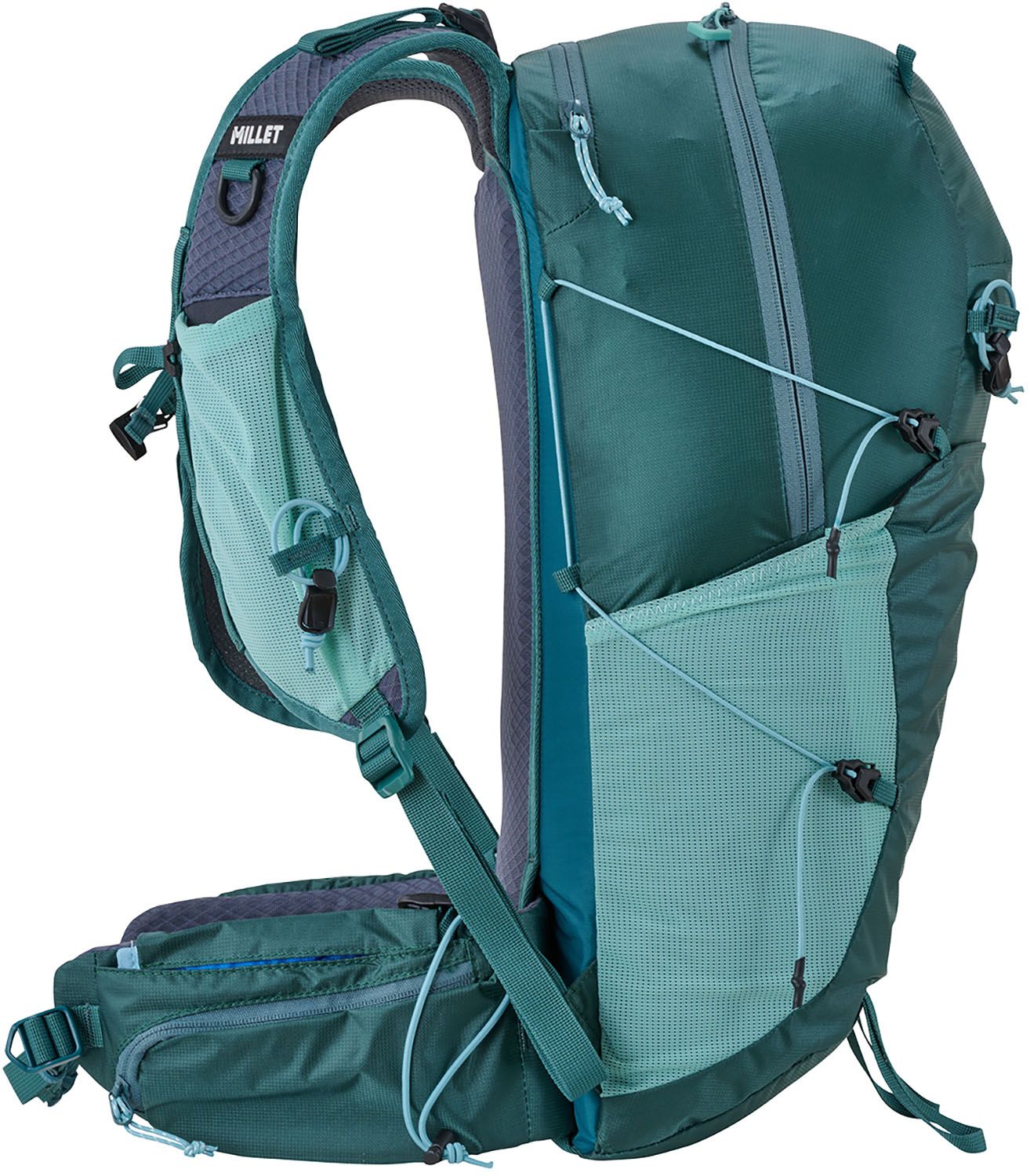 安定した背負い心地と実用性に特化した軽量ハイキング用リュックサック。重心が上部にくるよう計算された高重心設計に、高い通気性とフィット感を両立した背面パネルとベスト型ショルダーハーネスを開発しました。荷重安定性に優れたトップスタビライザーとヒップベルトによってスピーディな歩行時も荷重を感じにくく、不快な揺れも軽減します。様々な位置からすぐにアクセスできるよう配置されたポケットの他、左サイドのヒップベルトには歩行時にデットスポットとなる脇腹部分に拡張式ポケット[ボディハングキャリーシステム]を搭載し、行動中に素早い出し入れを可能にします。