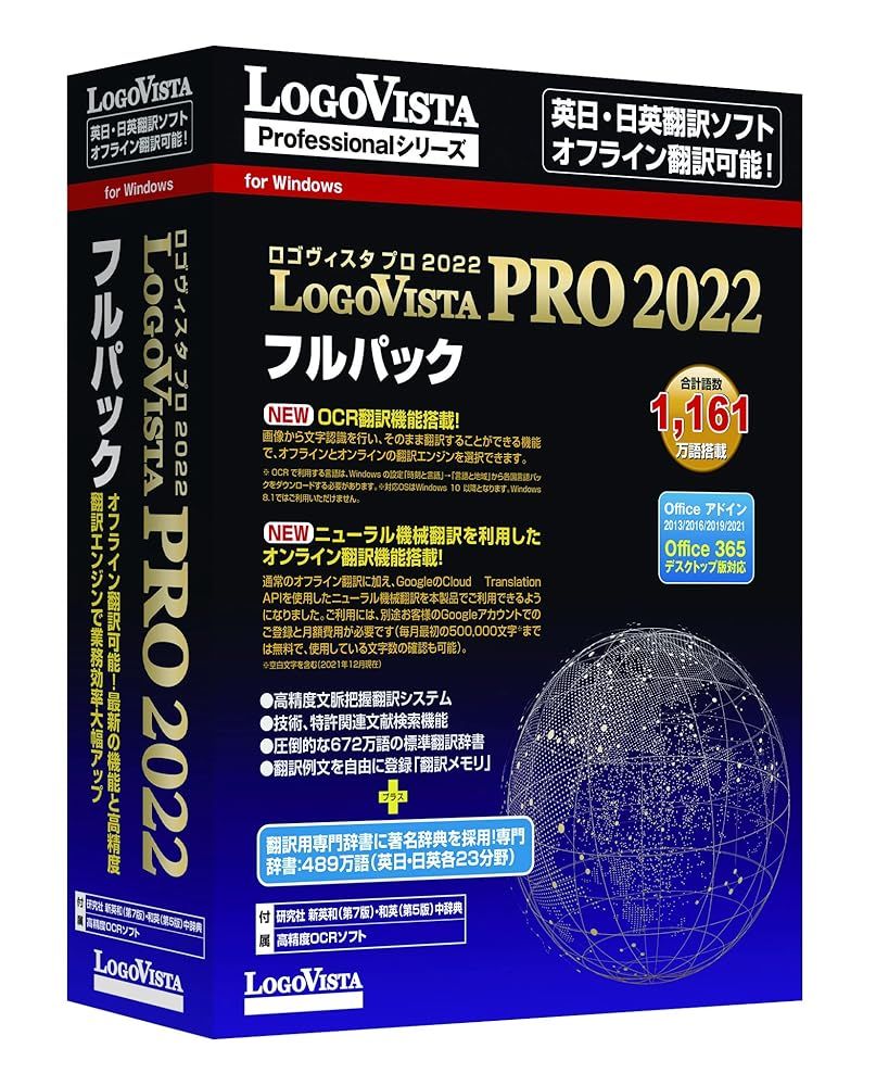 ベーシック」に日外アソシエーツ、日中韓辞典研究所、南山堂の著名辞典から23分野489万語の翻訳用専門辞書を追加し、業界最大の辞書語数1、161万語(英日661万語/日英500万語)で業務を強力にバックアップします。《LogoVista PRO 2022の特徴》●【NEW】ニューラル機械翻訳(オンライン版)を利用したオンライン翻訳機能搭載!●【NEW】文字認識を手軽に活用!文字認識(OCR)機能と翻訳機能を一体化したOCR翻訳機能を新規搭載 「主な仕様」高精度「LogoVista 翻訳エンジン」を搭載した研究やビジネス向け【英日・日英】翻訳ソフト