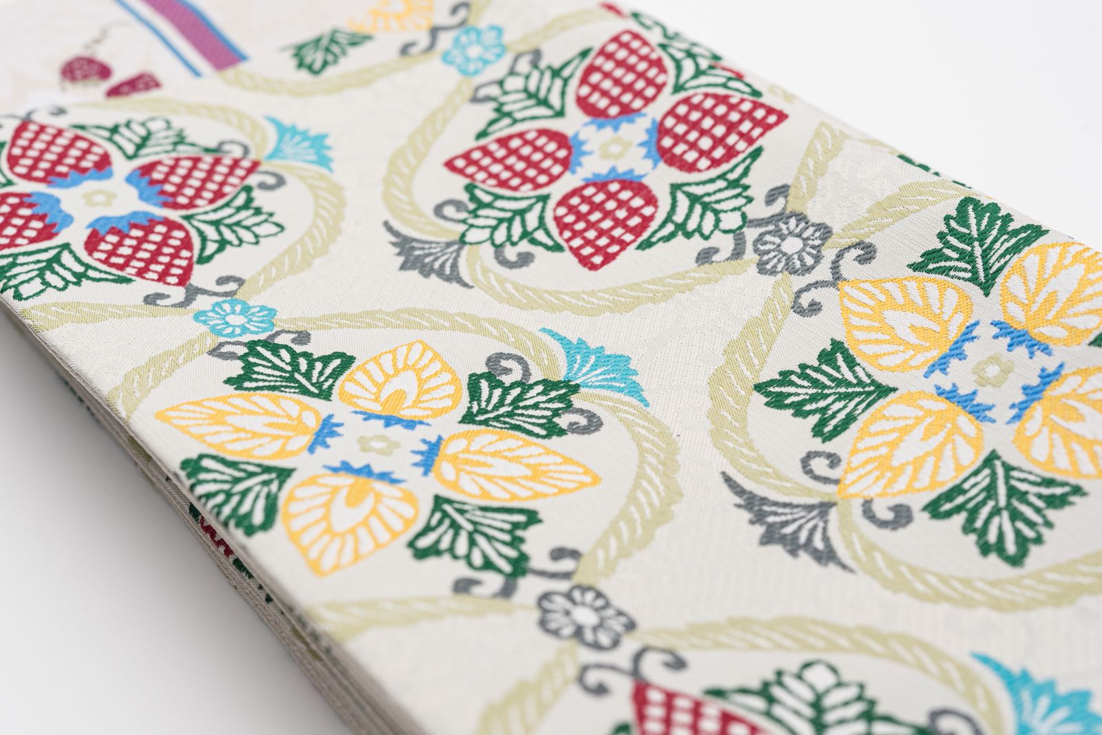 赤いイチゴと黄色いイチゴが交互に並ぶメルヘンチックでキュートなデザイン。
