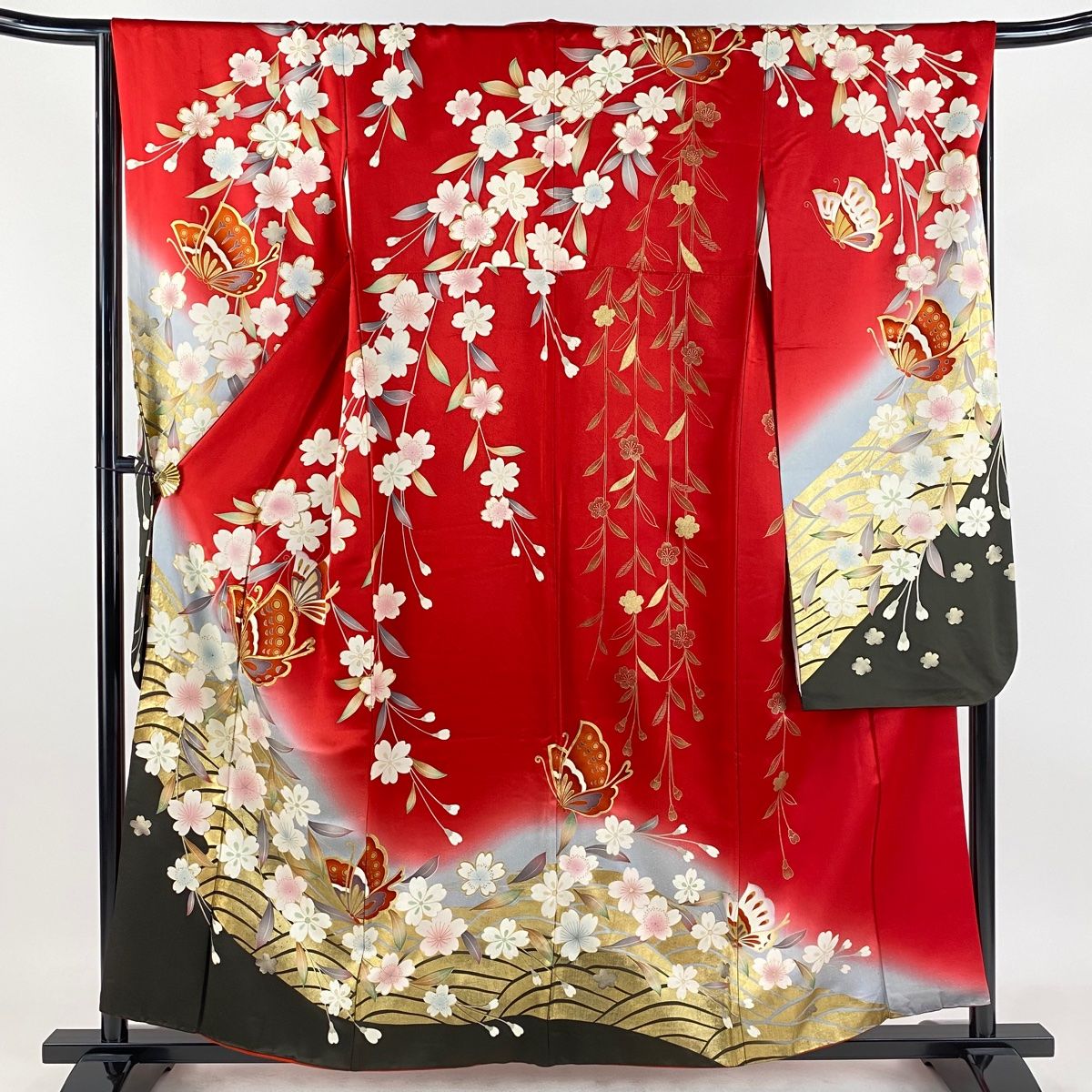 振袖 身丈159 cm 裄丈66 M 袷 蝶 枝垂れ桜 金糸 金彩 赤 正絹 秀品
