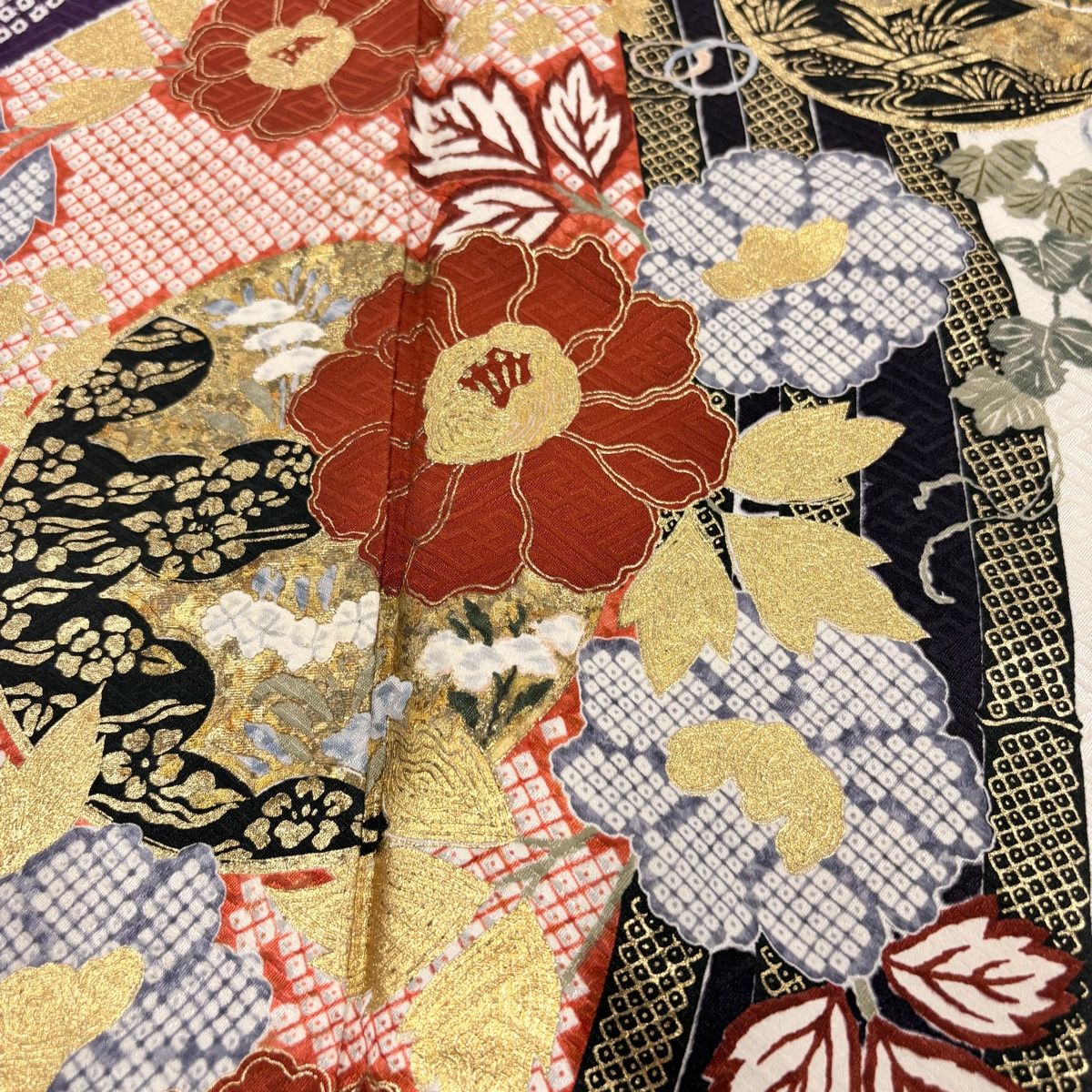 左後袖にシミ、衿周りに薄汚れ、表地所々に金彩の剥がれや変色がございます。
