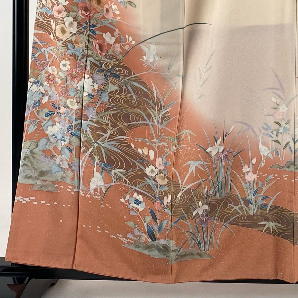 訪問着 身丈159.5 cm 裄丈64 M 袷 落款 草花 流水 金彩 ぼかし サーモンピンク 正絹 秀品