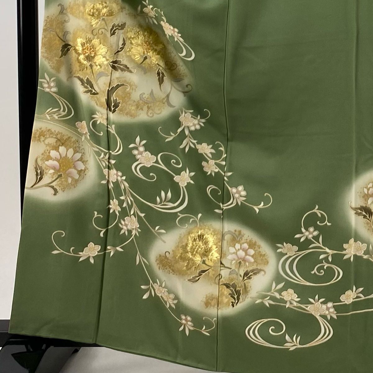 訪問着 身丈164 cm 裄丈67 M 袷 花唐草 草花 金糸 金彩 よもぎ色 正絹 秀品 一つ紋
