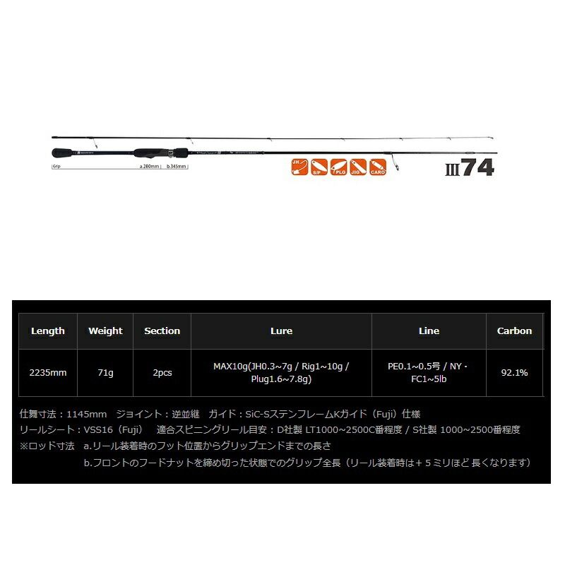 74というレングスを感じさせない取り回しの良さで、ジグヘッドやシンカーキャロ、軽量メタルジグやプラグなど、ライトゲームで用いる主要なメソッドを意のままに操作し、10mを超える水深でも損なわれない高感度性能で、繊細かつテクニカルにターゲットを誘い出します。