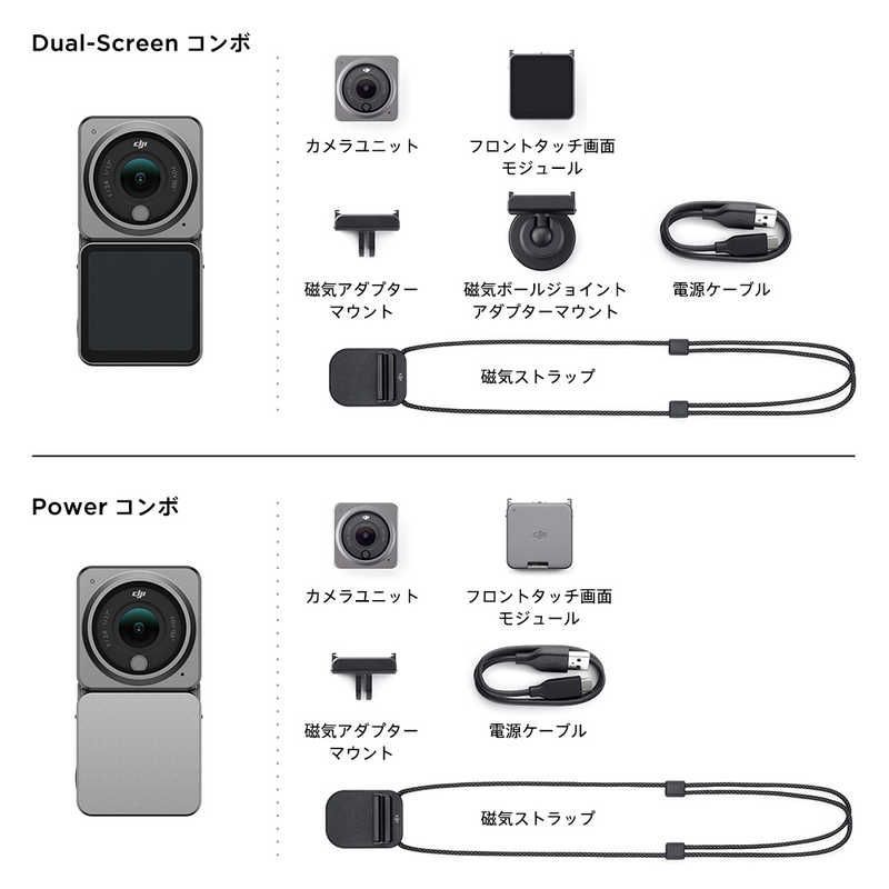 付属品 同梱物:DJI Action 2 カメラユニット×1、フロントタッチ画面モジュール×1、磁気アダプターマウント×1、磁気ボールジョイント アダプターマウント×1、電源ケーブル×1、磁気ストラップ×1