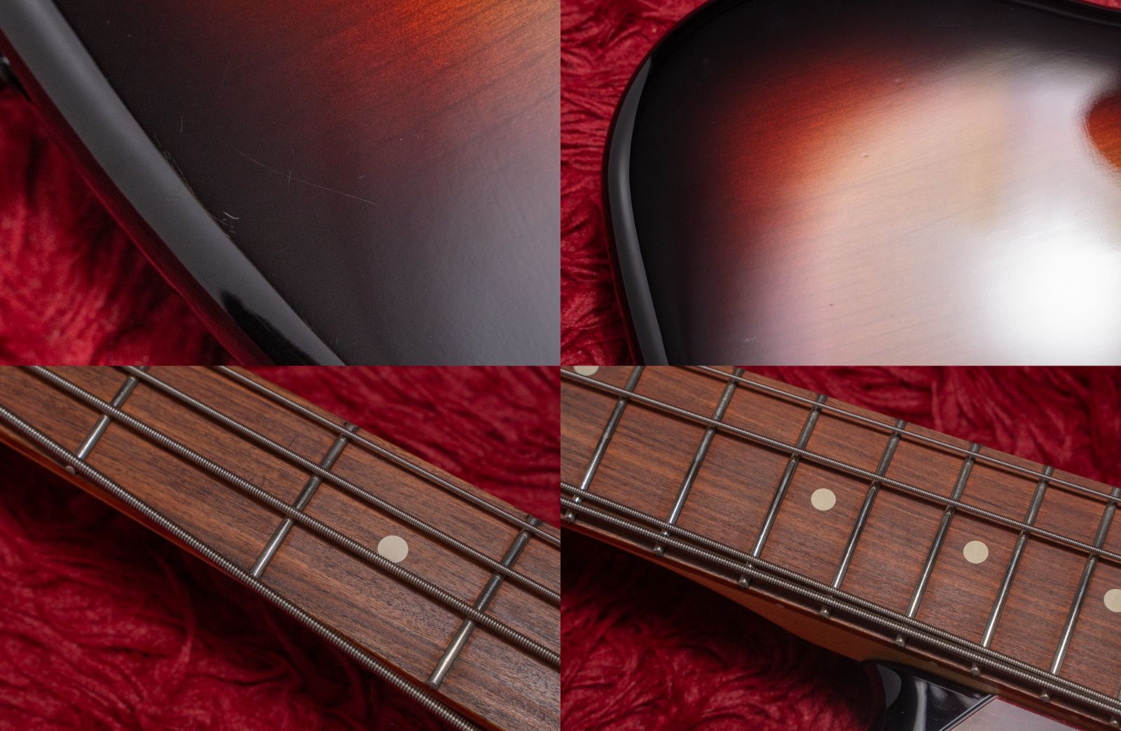 ボディや塗装面は、打痕、スクラッチ傷が複数箇所見受けられます。ブリッジカバーをつけていたようなビス穴の跡があります。