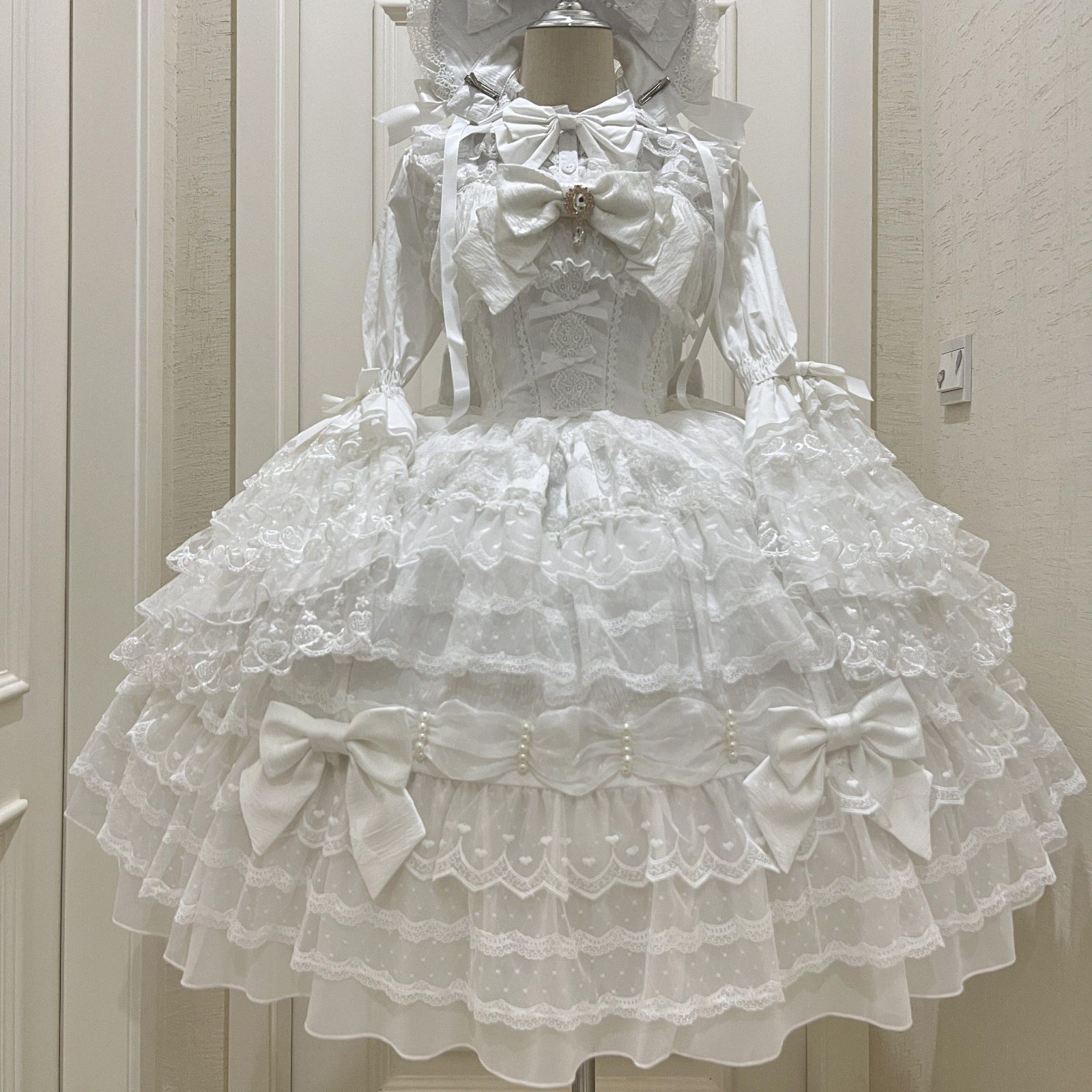 冬用 ロリータドレス JSK吊りスカート 多層レース&リボン装飾 ドール風 甘ロリ 豪華デザイン 撮影会 推し活 イベント用 プレゼントにも最適 ホワイト