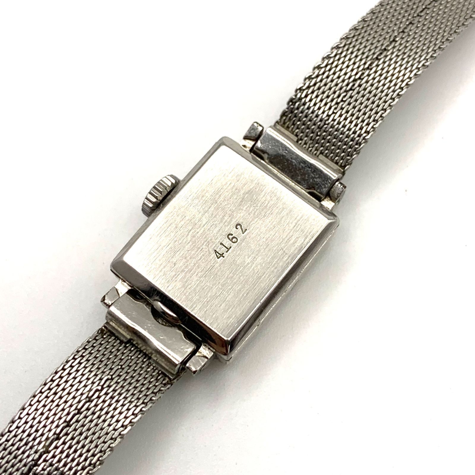 シルバーのメッシュバンドと長方形のケースを持つ手巻き時計。