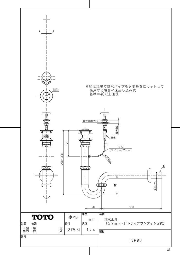 排水金具 32 mm Pトラップワンプッシュ式 TOTO T 7 PW 8